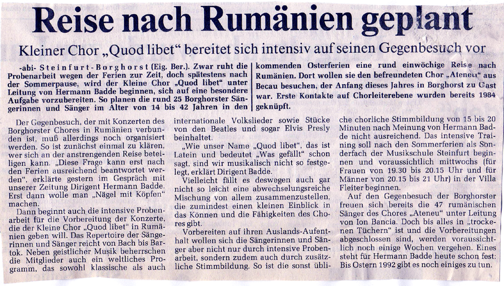 einen Besuch in Steinfurt - Borghorst. Nach den Sommerferien bereiteten sich die Chormitglieder intensiv auf einen Gegenbesuch in Rumänien vor, der Ostern 1992 stattfinden sollte. |