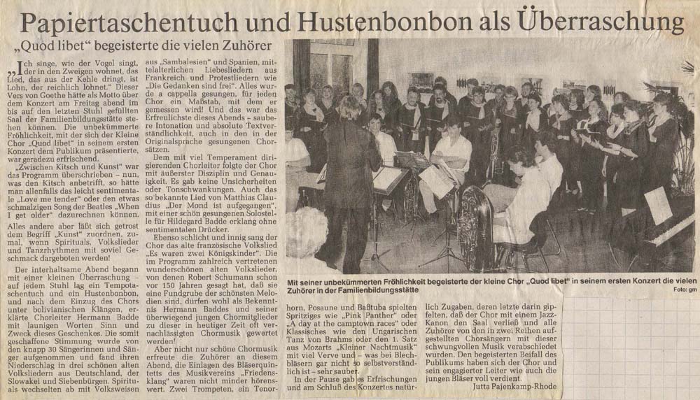 Das Konzert „Zwischen Kitsch und Kunst“ wurde in der Familienbildungsstätte, Steinfurt-Borghorst, aufgeführt. Dies war das erste eigene Konzert des Chores in größerem Rahmen. Bisher hat er sich vorwiegend der Gestaltung von heiligen Messen zu Feiertagen verpflichtet gefühlt, weil der Chor unter anderem aus Mitgliedern des ehemaligen Jugendchores der Pfarrgemeine St. Nikomedes entstanden ist. Er möchte weiterhin versuchen, mit viel Engagement dieser Aufgabe neben der Gestaltung von weltlichen Konzerten gerecht zu werden. |