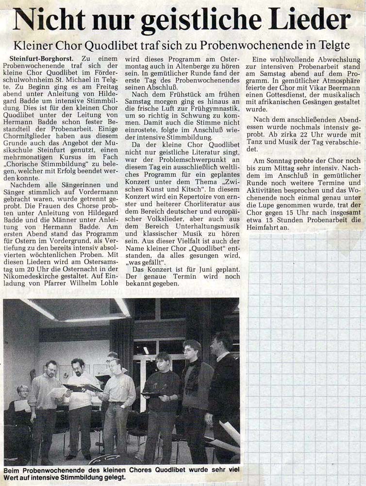 | 00.07. | Für intensive Proben trafen sich die Chormitglieder in Telgte im Förderschulwohnheim St. Michael zu einem Chorwochenende |