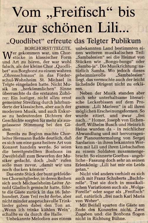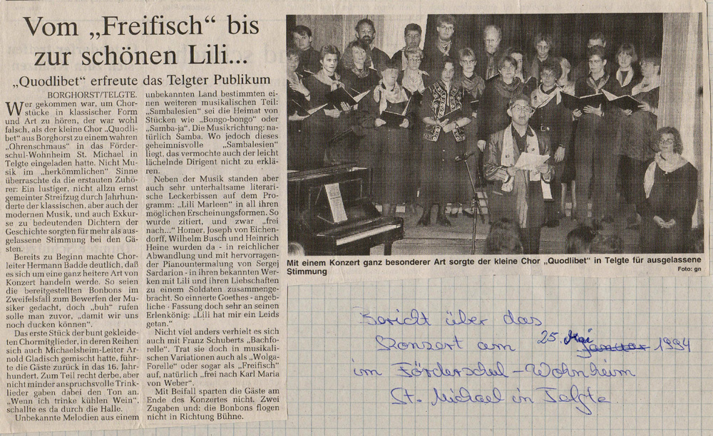 | 25.05. | Die Wiederholung des Konzertes „Ein köstliches Programm – Ohrenschmaus“ unter der Leitung von Hermann Badde fand im Förderschulheim St. Michael, Eichenweg 38, in Telgte statt. Der Chor konnte wieder einen schönen Erfolg verbuchen. |