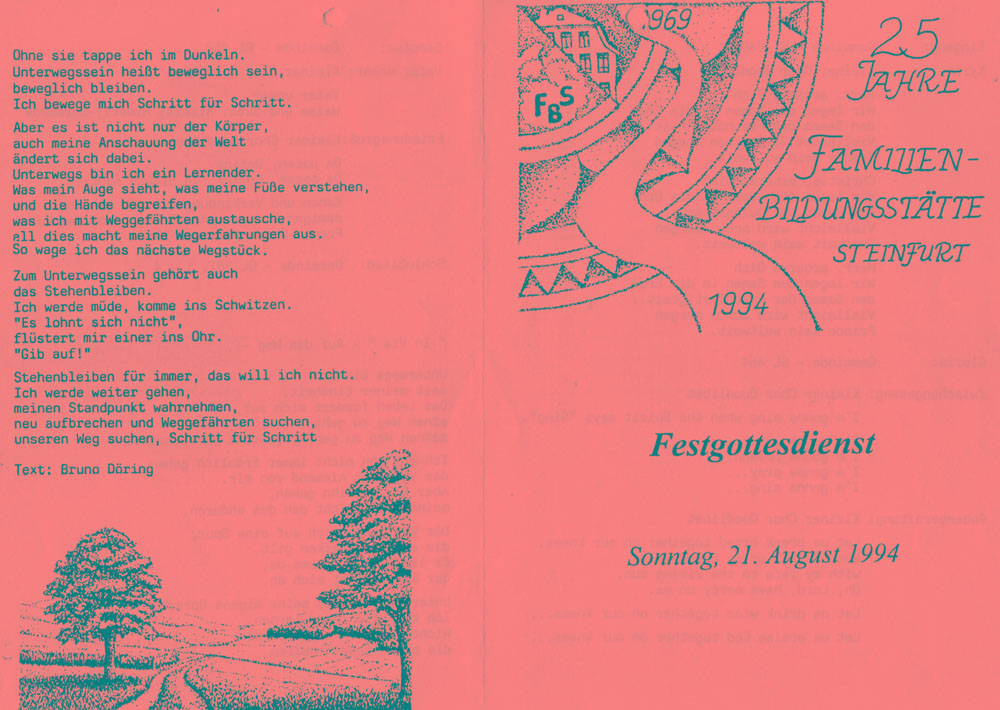 | 21.08. | An diesem Tag wurde das 25-jährigen Bestehens der Familienbildungsstätte Steinfurt gefeiert. Zunächst konnte der Chor den Festgottesdienstes um 09.30 Uhr mitgestalten. Beim anschließenden Empfang brachte er dann noch ein Ständchen für die Versammelten. |