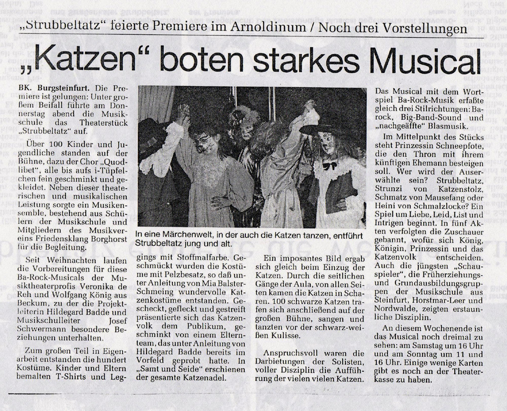 | 16.09. | Am Freitag um 18.00 Uhr konnte dann das Kindermusical "Strubbeltatz" in einer 1. Vorstellung erfolgreich aufgeführt werden. |