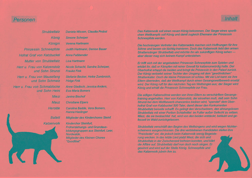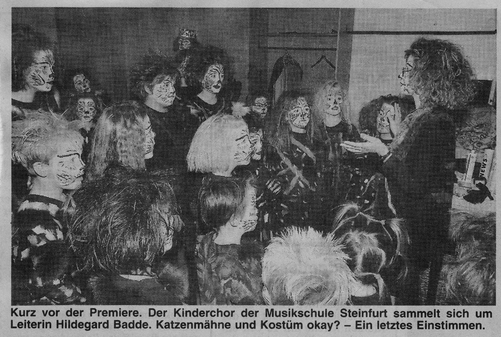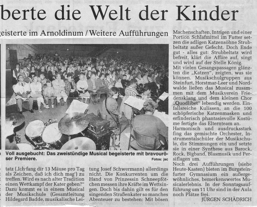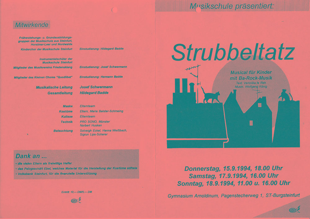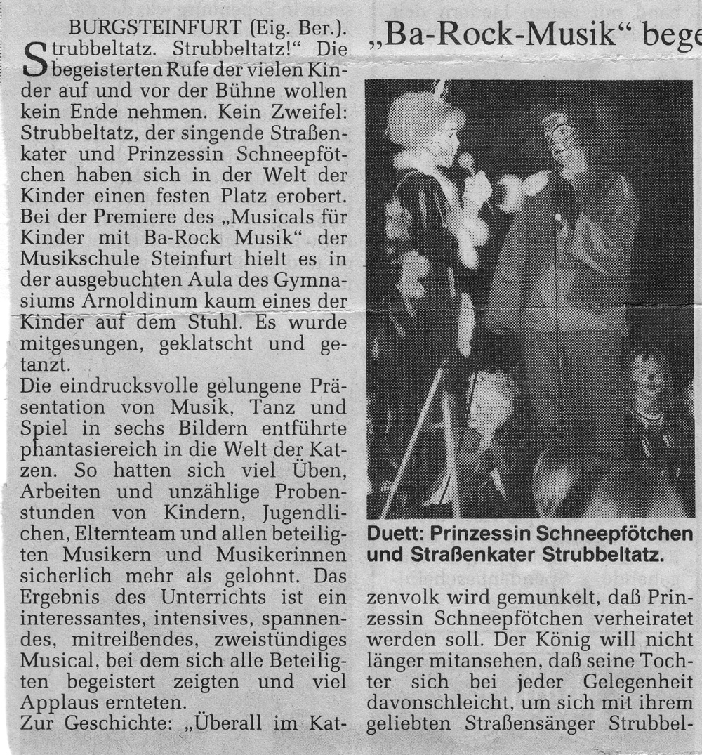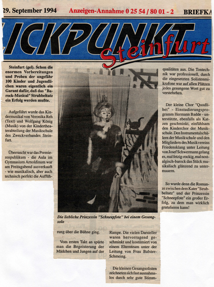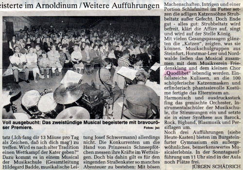 | 18.09. | Der Sonntag wurde dann für den Chor wieder ein schöner Erfolg. Jeweils um 11.00 Uhr und um 16.00 Uhr, fanden die 3. und 4. der gelungenen Aufführungen des Kindermusicals „Strubbeltatz“ im Gymnasium Arnoldium statt. |