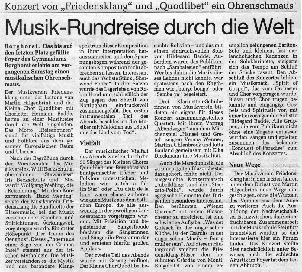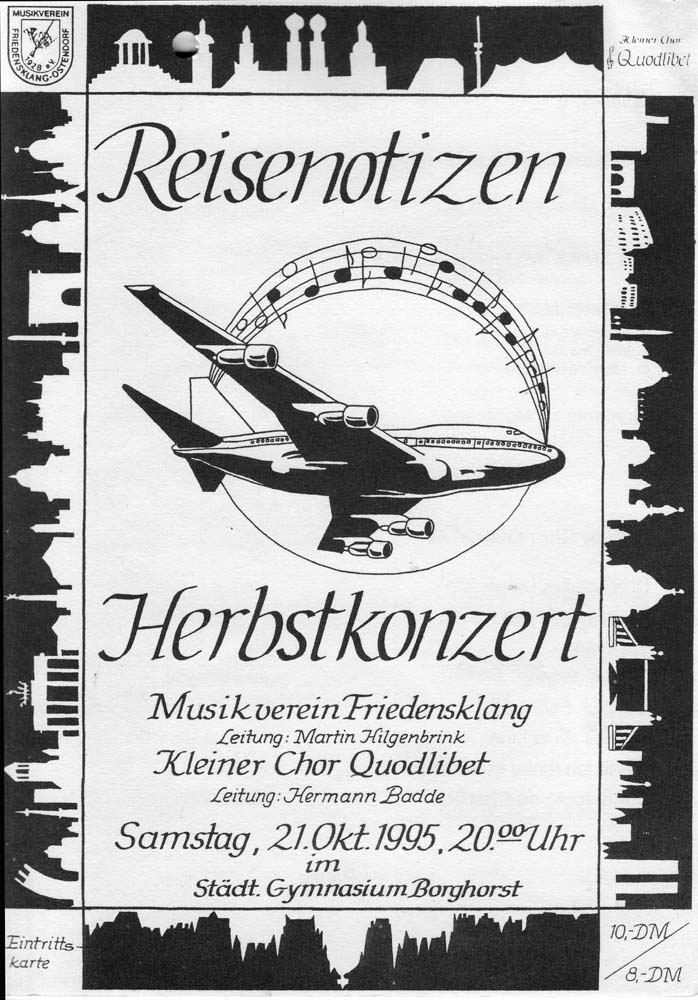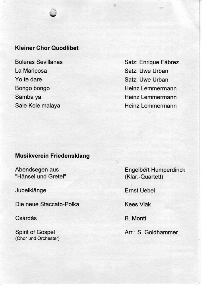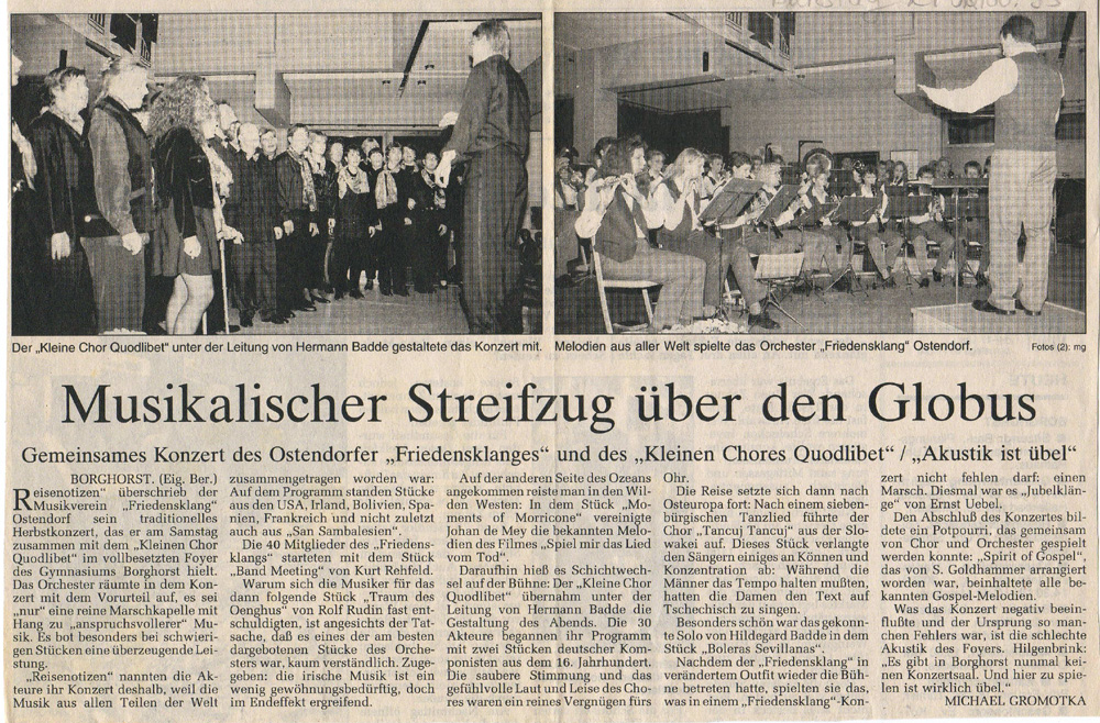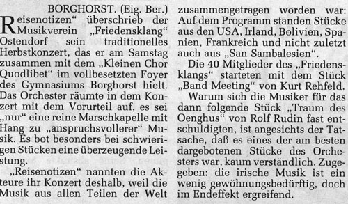 | 21.10. | Das traditionelle Herbstkonzert unter dem Titel "Reisenotizen" des Orchesters Ostendorfer „Friedensklang“ wurde diesmal gemeinsam mit dem „Kleiner Chor Quodlibet“ gestaltet. Im Wechsel mit dem Orchester brachte der Chor interessante musikalische Leckerbissen aus aller Welt zu Gehör. |