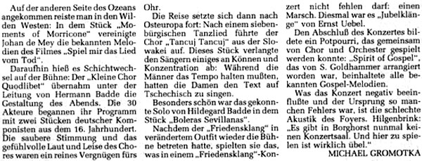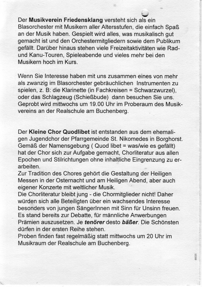 ausgestattet. Da der bisherige „Notenschrank“ zu wenig Platz aufwies, wurde beschlossen, die Noten an die Chormitglieder zu verteilen. So wurden vor den Osterferien die bisherigen Mappen und Noten eingesammelt. Nach den Sommerferien bekam jedes Chormitglied eine Mappe mit sämtlichen Noten, alphabetisch sortiert. Gleichzeitig wurde ein zweiter Ordner ausgegeben, der als aktuelle Chormappe dienen soll. Weiter bekamen die Chormitglieder alle je eine schwarze Chormappe, die für die Aufführungen genutzt werden sollen. Da diese Umstellung 1.500,- DM kostet, wird von jedem Mitglied für diese Mappen und Noten eine „Leihgebühr“ von 35,00 DM eingesammelt, die zurückerstattet wird, wenn aus welchem Grund auch immer, die Mappen mit Noten ordentlich zurückgegeben werden. So bleiben die Dinge Eigentum des Chores! |