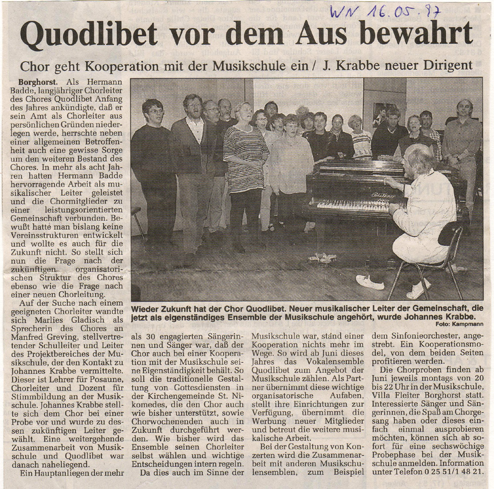 | 01.06. | Neuer Chorleiter auf Wunsch des Chores wurde Johannes Krabbe von der Musikschule |