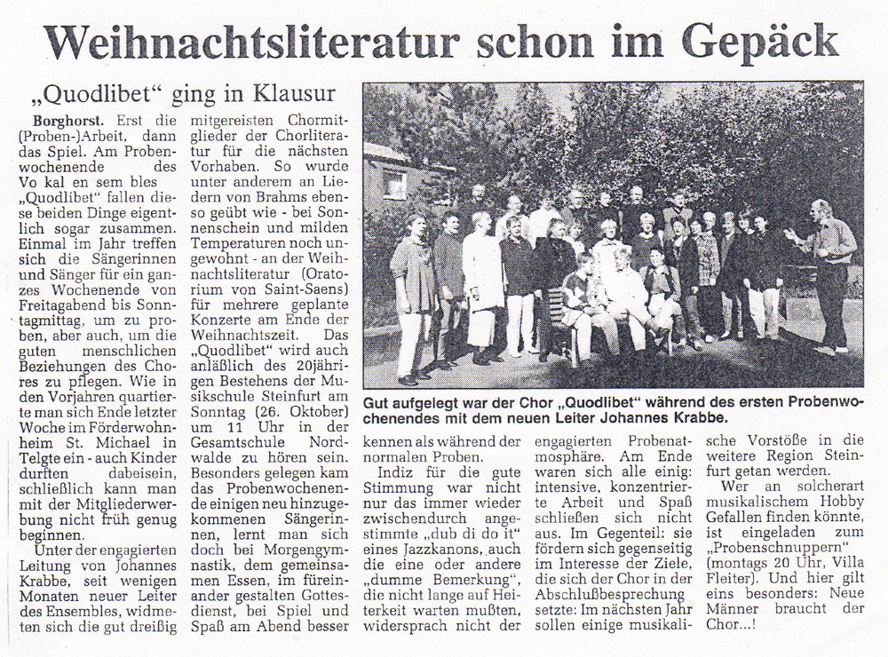 | -- | Der Name des Chores, der bis dahin „Kleiner Chor - Quodlibet“ hieß, wurde in diesem Jahr in Abstimmung mit den Chormitgliedern in „Vokalensemble Quodlibet“ geändert. Auch über ein neues Logo wurde nachgedacht. Mit der Umstrukturierung und der Neuorientierung des Chores hat sich auch der Probentag geändert. Das brachte es leider mit sich, dass einige Chormitglieder aus terminlichen Gründen leider ausscheiden mussten. |
