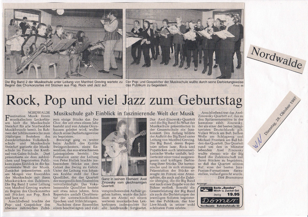 | 26.10. | Im Rahmen der Jubiläumswochen zum 20jährigen Bestehen des Zweckverbandes Volkshochschule und Musikschule Steinfurt, fand im Forum der Kardinal von Galen - Gesamtschule, Nordwalde, eine Festveranstaltung statt. Unter anderem trat auch das "Vokalensemble Quodlibet" auf. |