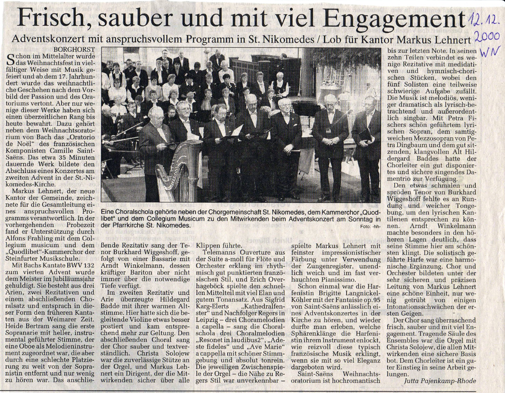 | 10.12. | Gemeinsam mit dem Kirchenchor der Pfarrgemeinde St. Nikomedes, Steinfurt-Borghorst, wurde das Weihnachtsoratorium von C. Saint - Saens und von J. S. Bach "Bereitet die Wege, bereitet die Bahn" aufgeführt. Die Gesamtleitung hatte Markus Lehnert. |