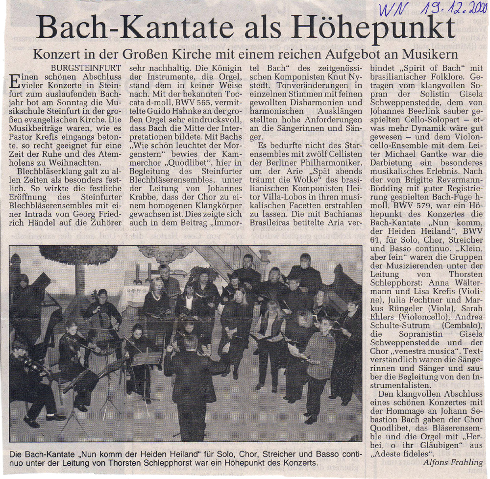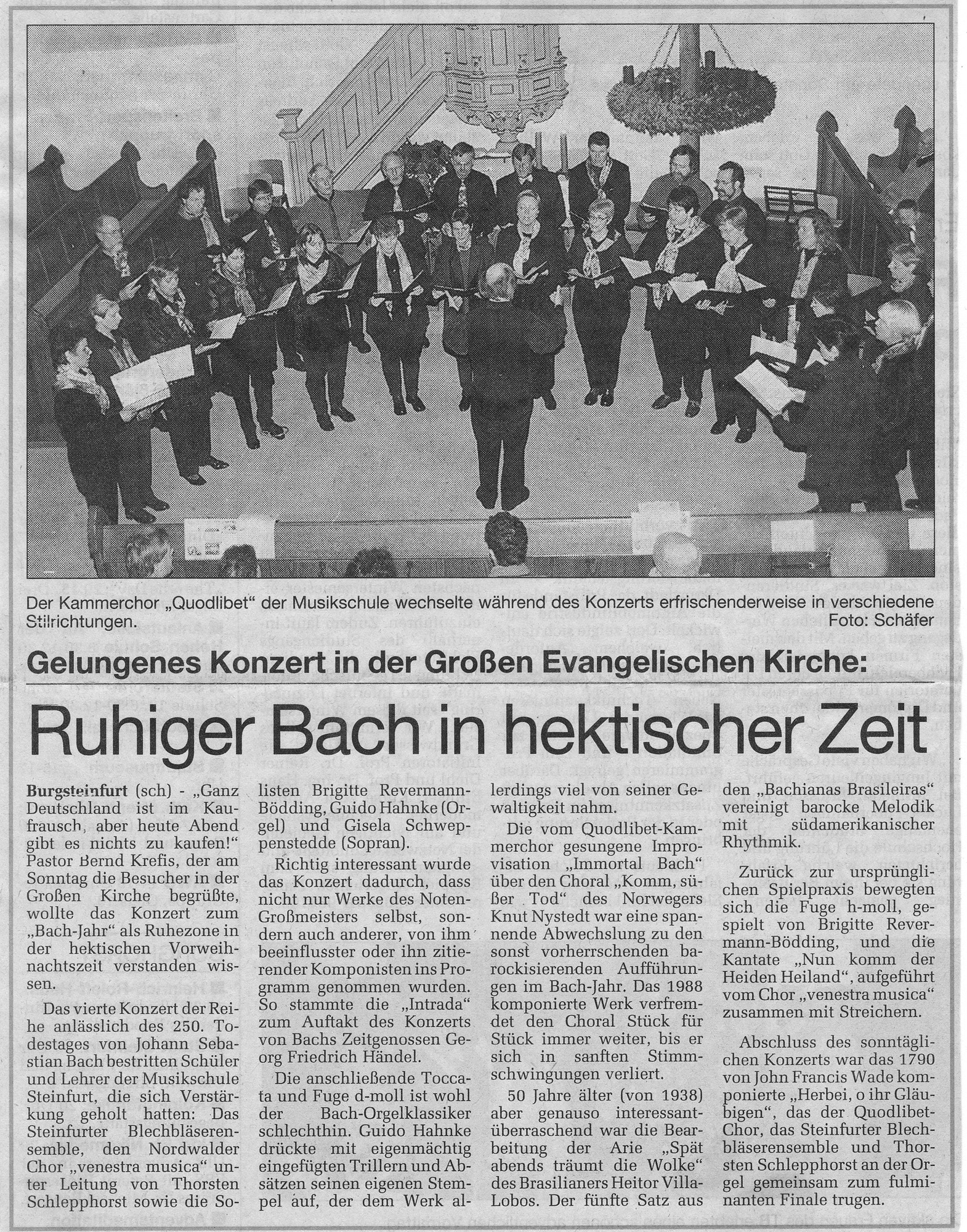 | 17.12. | Zum 250. Todestag von Johann S. Bach beteiligte sich der Chor am Weihnachtskonzert ´der Musikschule in der Großen evangelischen Kirche in Steinfurt. Auch das Steinfurter Blechbläserensemble und viele Solisten wirkten zusammen. |