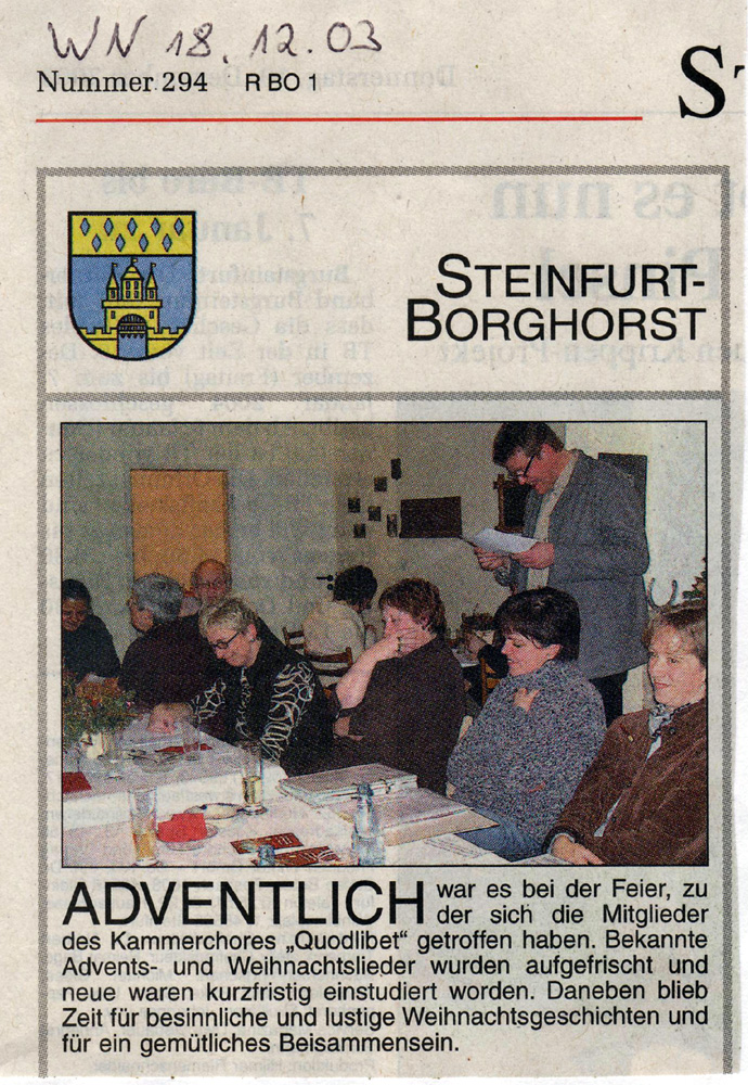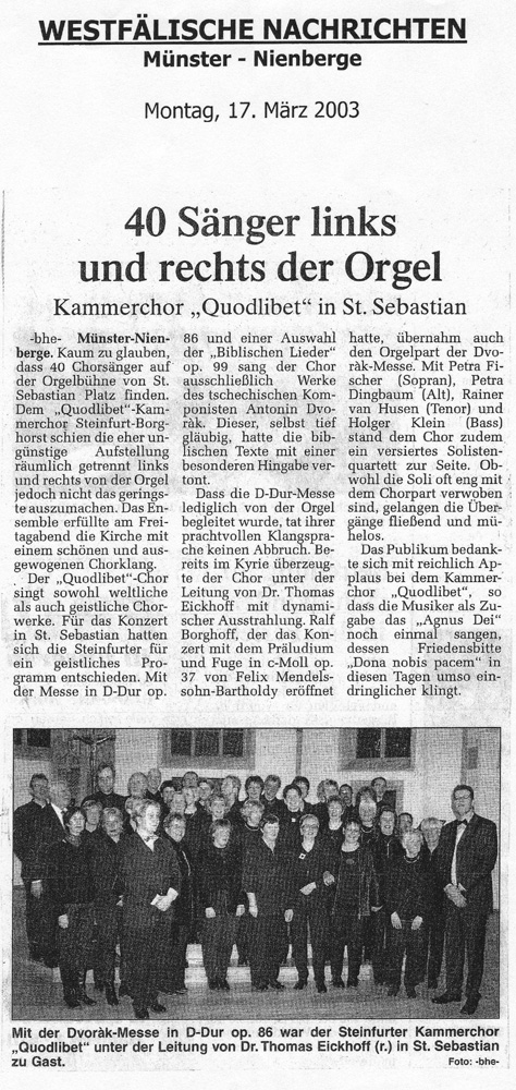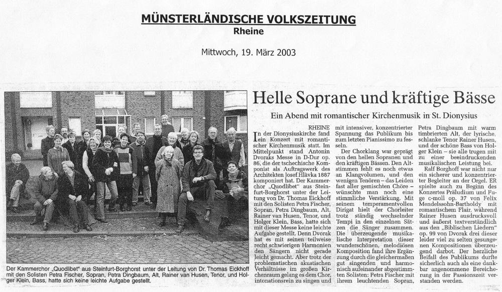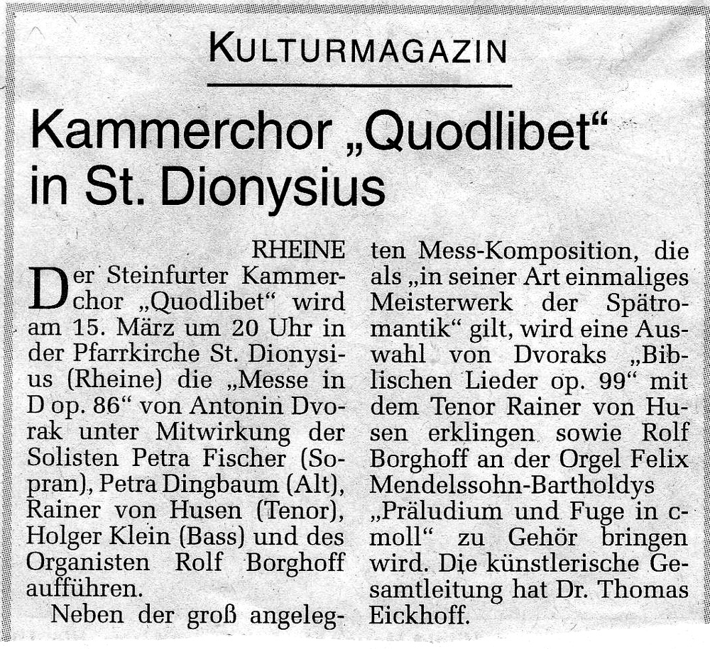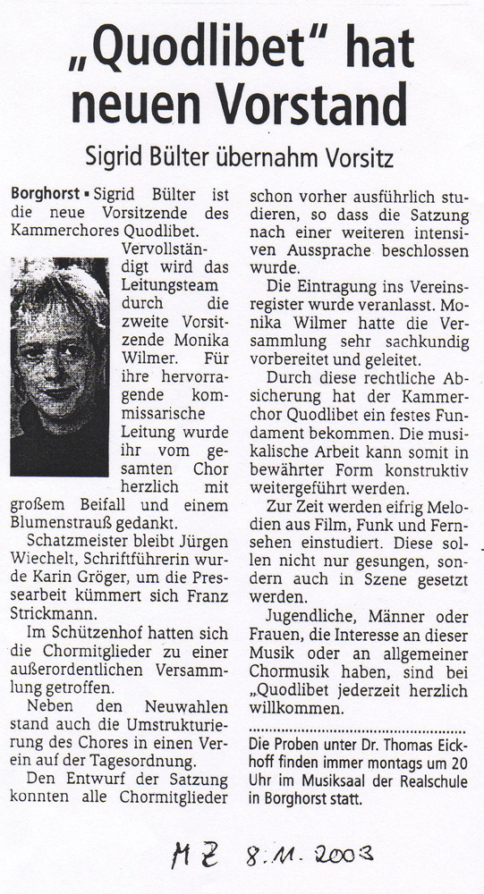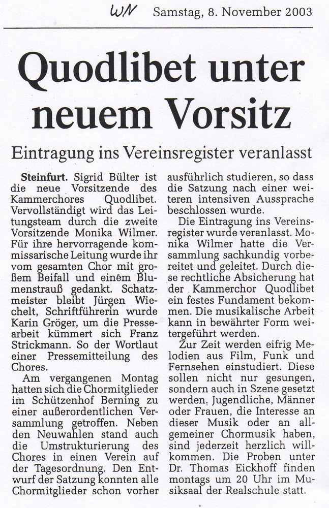 Umstrukturierung des Chor in einen Verein stand an! Dazu war eine offizielle Vereins-Gründungsversammlung notwendig, die nun abgehalten wurde. Anschließend konnte der Chor ins Vereinregister der Stadt Steinfurt eingetragen werden. Somit haben wir nun die rechtliche Sicherheit und den Namenszusatz e. V. Als Vorsitzende des Kammerchor Quodlibet e.V. wählten die Mitglieder Sigrid Bülter, als zweite Vorsitzende Monika Wilmer. Das Amt des Schatzmeister übernahm Jürgen Wiechelt, die Aufgaben als Schriftführerin Karin Gröger und als Pressewart wurde Franz Strickmann tätig. |
