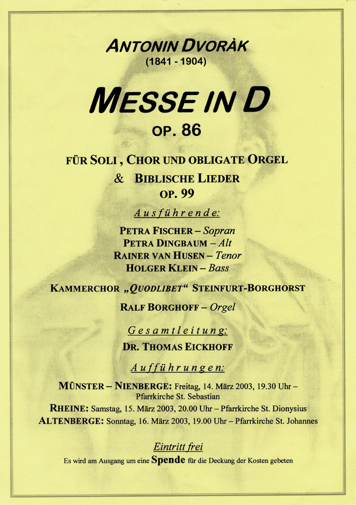 Unser Chormitglied Karin Gröger malte den Kopf des Komponisten Antonin Dvoràk für die Plakate. Der gesamte Chor probte mit den Solisten an den Aufführungsorten, um sich an die jeweils unterschiedliche Akustik in den Kirchen zu gewöhnen. Dann kamen die Aufführungen, die den Beteiligten viel Freude machten und mit großem Erfolg gemeistert wurden. |