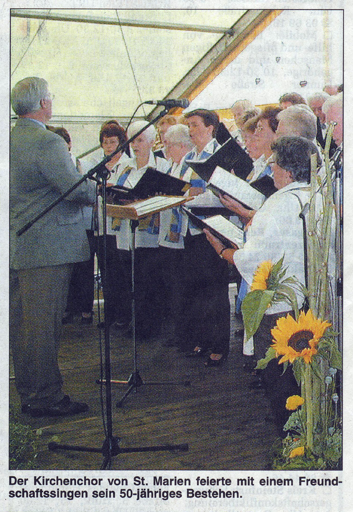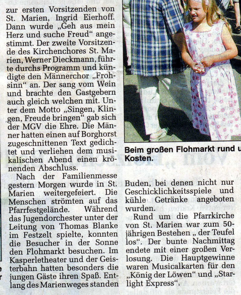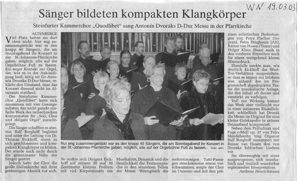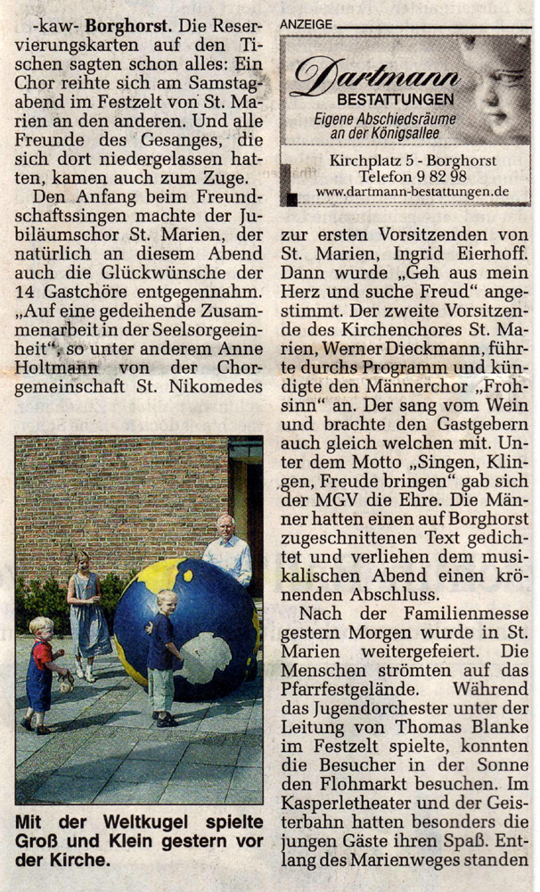 Der Kirchenchor St. Marien in Steinfurt–Borghorst hatte auch unseren Chor zur Jubiläumsfeier eingeladen. Mit vielen anderen Chören nahmen wir die Einladung zu diesem Freundschaftssingen gerne an, um dem Jubiläumschor unter anderem mit unseren Liedern zu gratulieren. |